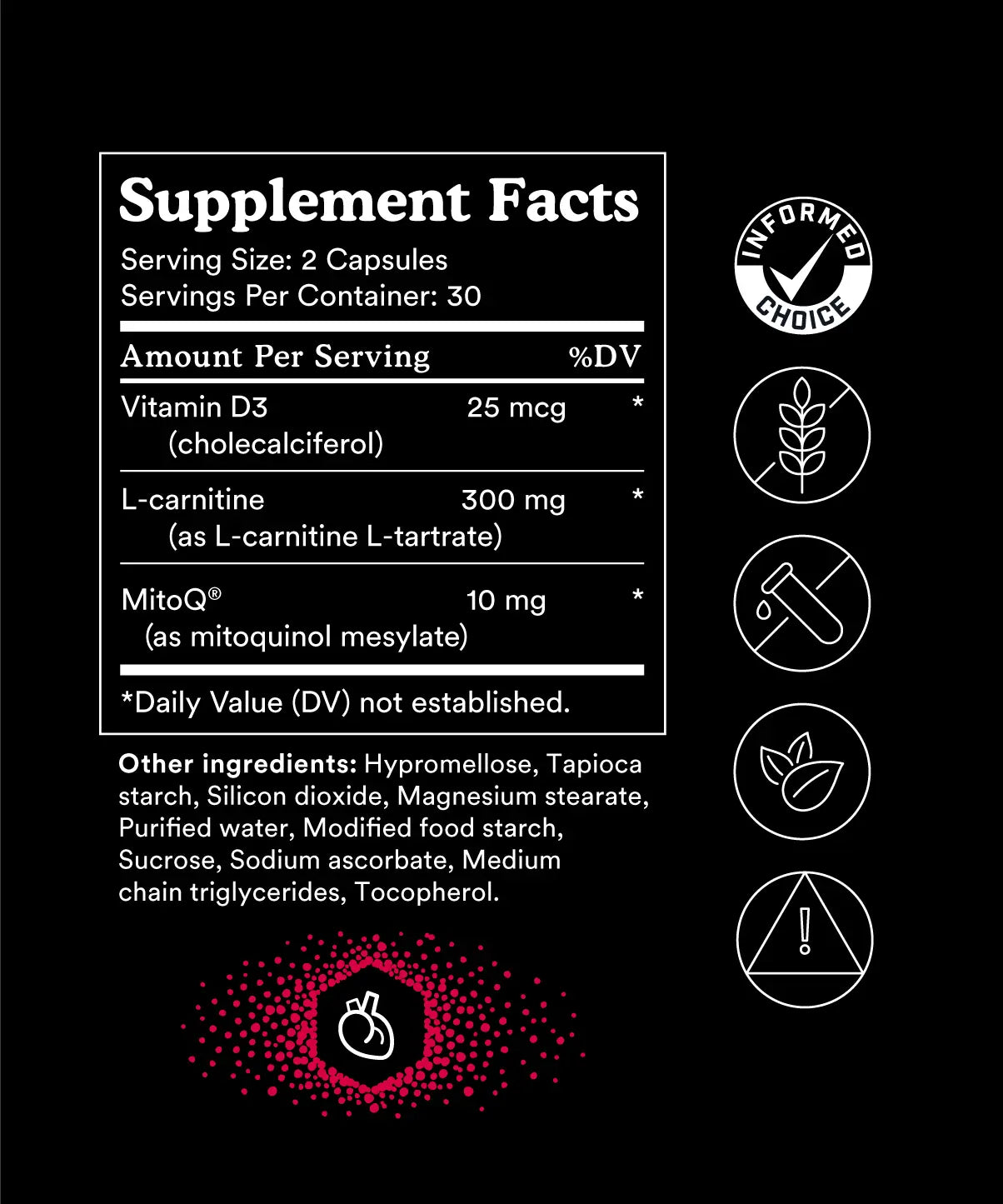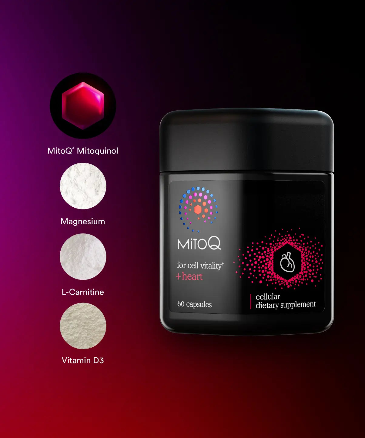 Contains MitoQ® Mitoquinol, our world-first mitochondria-targeted antioxidant, combined with L-carnitine, Magnesium and Vitamin D3, to help reduce oxidative stress and support cellular energy. This formula supports blood flow and already healthy cholesterol levels, promoting optimal cardiovascular health.