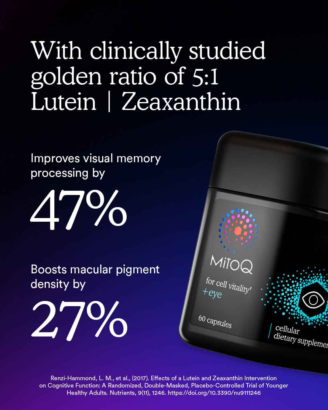 Absolutely. MitoQ +eye is backed by science and clinically supported ingredients. Studies show that Lutein and Zeaxanthin can increase macular pigment density by up to 27% and improve visual performance, while MitoQ® targets oxidative stress at the cellular level to keep your eyes energized and protected.