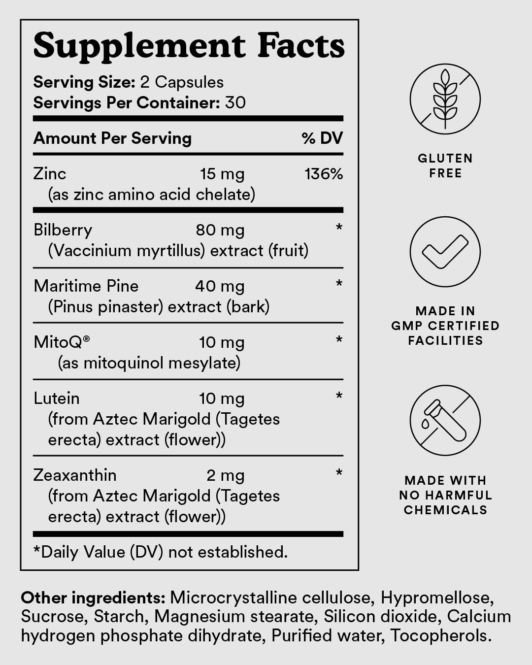 Zinc (as zinc amino acid chelate) 15 mg, 1Mirtogenol® composed of 2MirtoSelect® Bilberry (Vaccinium myrtillus) extract (fruit) 80 mg and 3Pycnogenol® Maritime Pine (Pinus pinaster) extract (bark) 40 mg, 4MitoQ® (as mitoquinol mesylate) 10 mg, 5Lutemax 2020® composed of Lutein from Aztec Marigold (Tagetes erecta) extract (flower) 10 mg, Zeaxanthin from Aztec Marigold (Tagetes erecta) extract (flower) 2 mg.