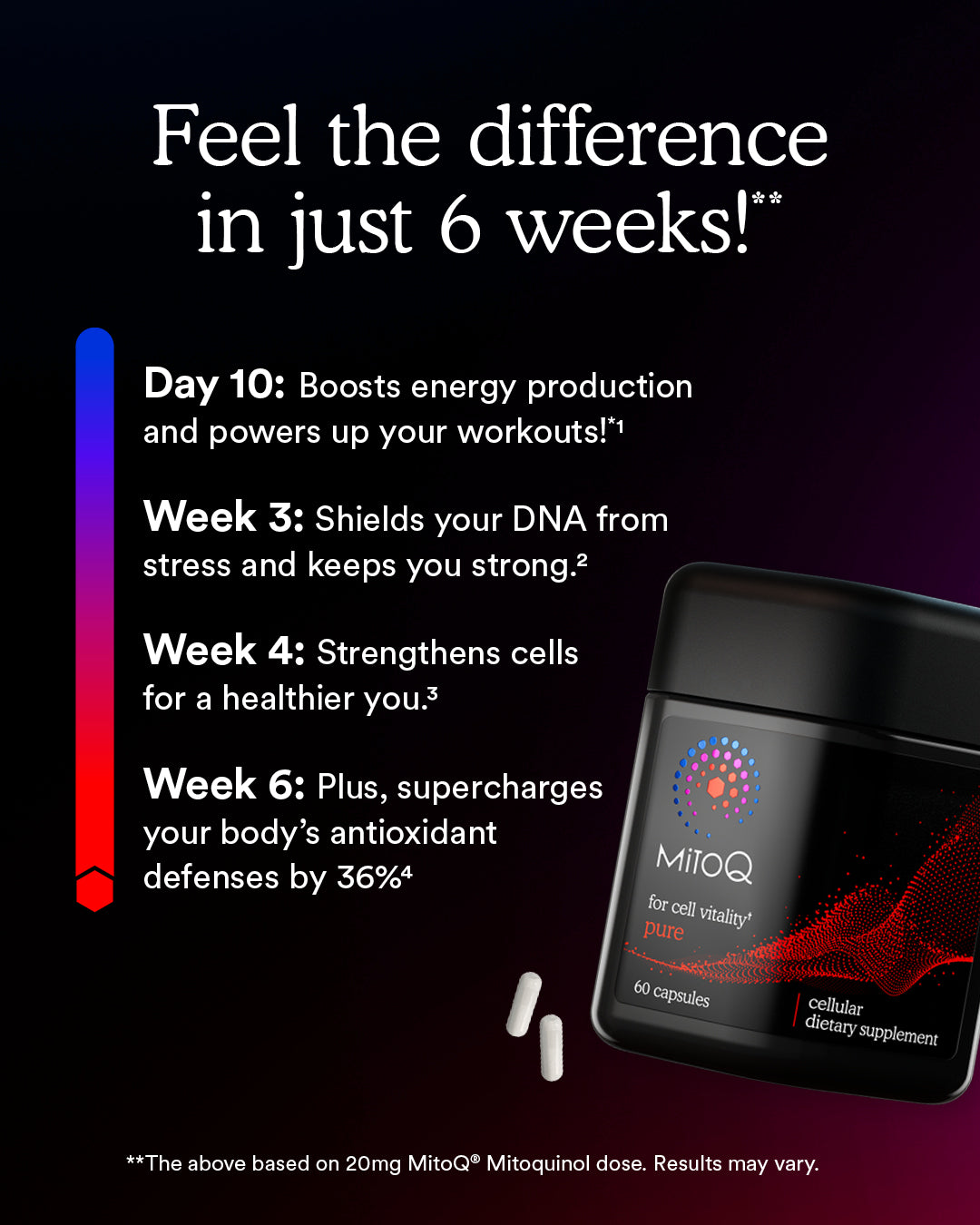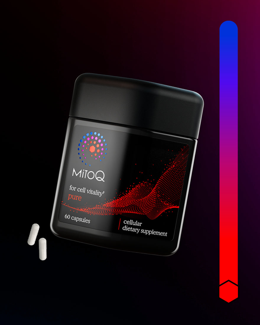 MitoQ Pure reduces oxidative stress and regenerates aging cells—fighting aging at its source to help you feel stronger, sharper, and more energized every day.