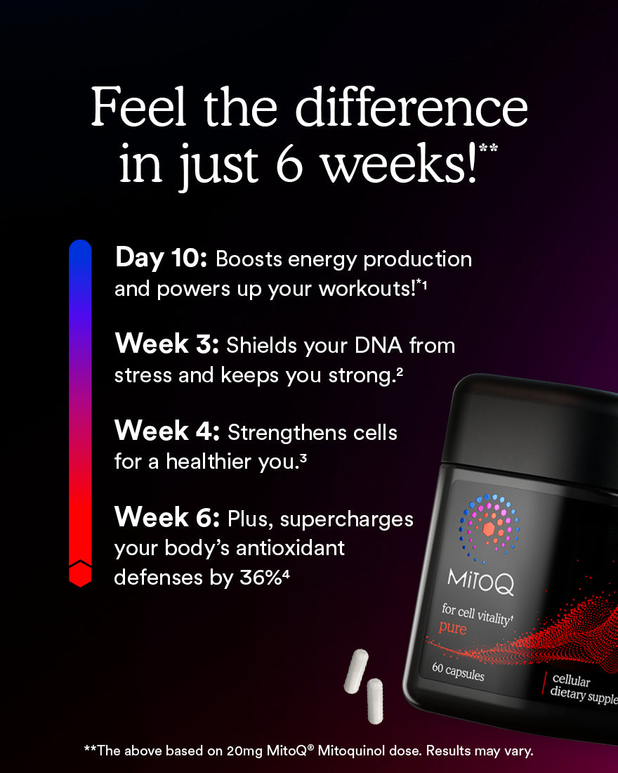 MitoQ’s patented molecule—Mitoquinol Mesylate—is the world’s first mitochondria targeted-antioxidant. Backed by over 25 clinical trials and 900 peer reviewed papers, MitoQ® Mitoquinol has been shown to reduce oxidative stress, support mitochondrial performance, and improve key health markers across multiple systems in the body.